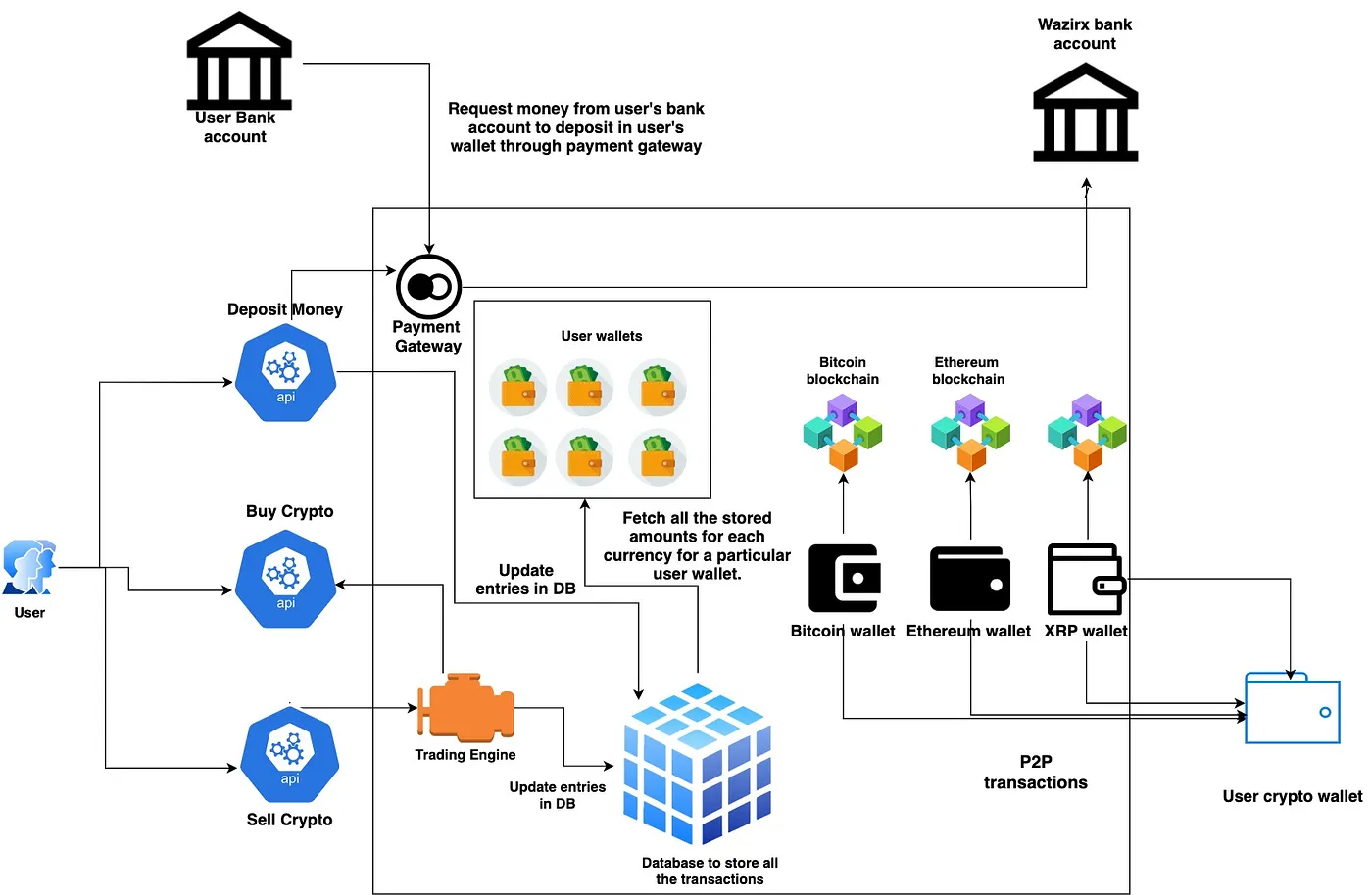 • This system uses APIs to interact between the frontend, trading engine, and wallet system.